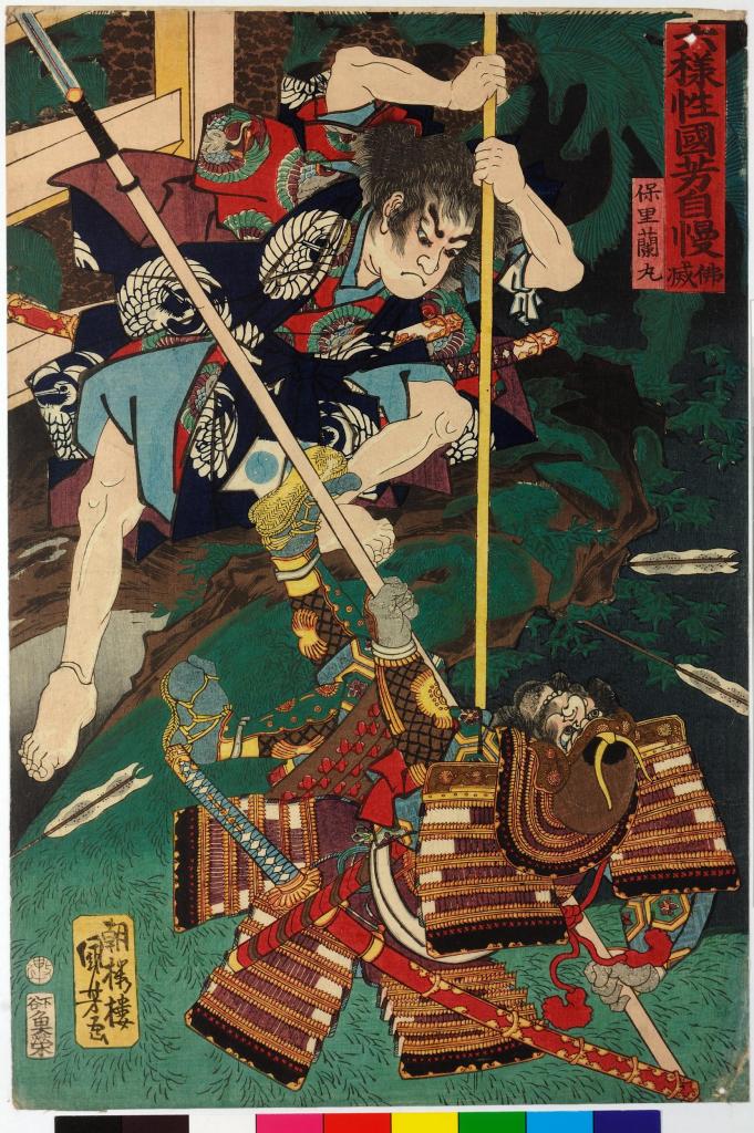 Utagawa Kuniyoshi: Butsumetsu (A Most Unlucky Day) from the series Rokuyosei Kuniyoshi jiman (Kuniyoshi’s Analogies for the Six Conditions of Nature). Ranmaru on a rock spearing Yasuda Sakubei in the defense of the Honnō-ji temple from Akechi Mitsuhide. © The Trustees of the British Museum. Shared under a Creative Commons Attribution – Non-Commercial – ShareAlike 4.0 International (CC BY-NC-SA 4.0) licence.