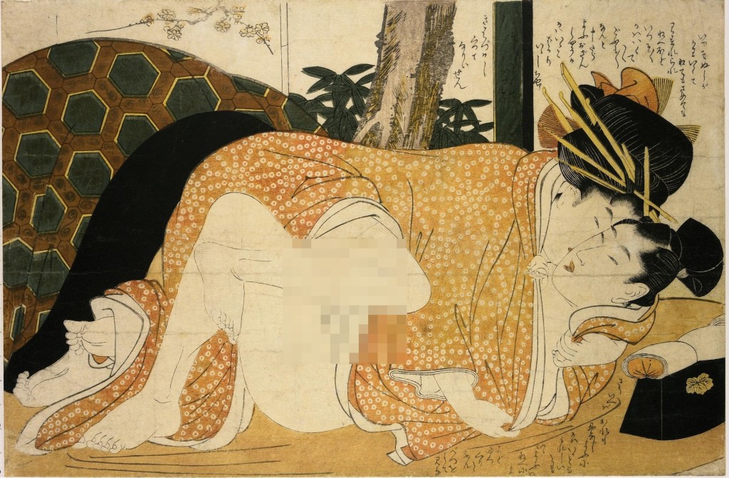 With its legacy of producing period dramas Toei may seem like a mismatch for a soft-core flick. Tokugawa Sex Ban is set in feudal Japan and well within their wheelhouse. The opening credits unfurl with a stylish montage of erotic ukiyo-e prints. These are called shunga. Shunga depict a world free of Judeo-Christian restraints on human sexuality and are typically explicit— way more explicit than this movie— and the artworks accompanying my commentary have been pixelated accordingly. I do this not to spare my readers’ sensibilities (I trust that you are all adults with discerning tastes) but to avoid falling afoul of WordPress’s terms and conditions.